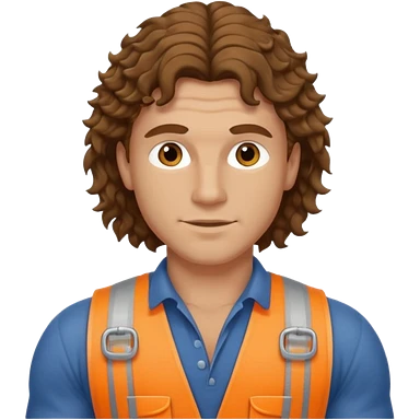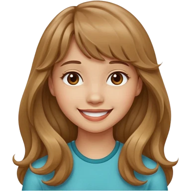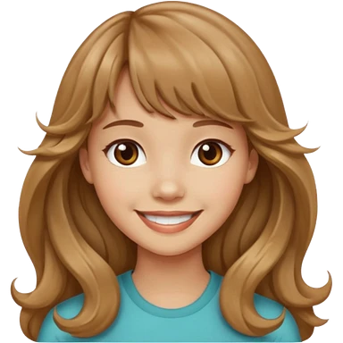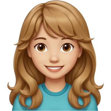 Please generate a portrait of a pretty girl with long, wavy, light brown hair and bangs, she's smiling. emoji