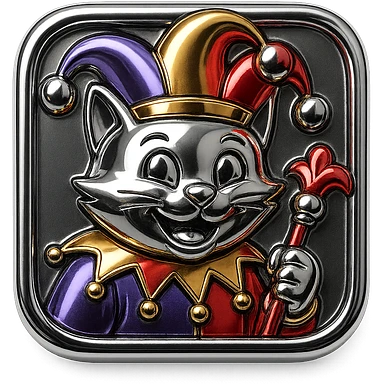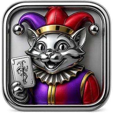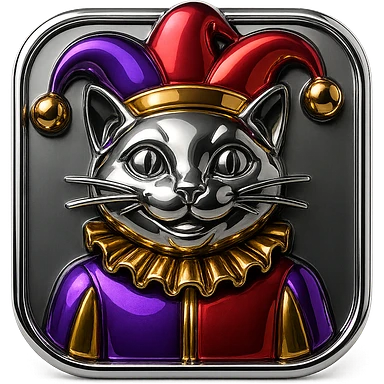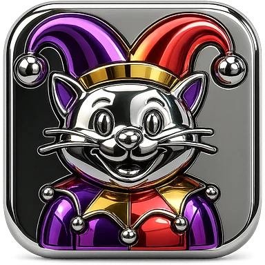 crazy colorful cute little cat jolly joker from poker, medieval, vintage, court jester, mac os icon, purple, gold and red color, half body. Squared shape as 3D mac os icon, symmetrical emoji