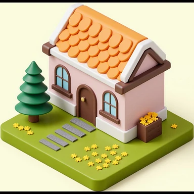 Exterior view of a small cartoon-style farm with a tiny wheat field, a few golden stalks swaying, wooden fence, small irrigation pipes along the soil emoji