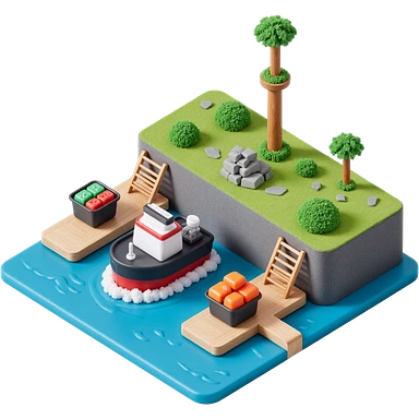 Exterior view of a floating coral farm built on a small square platform above glowing ocean waves, candy-colored coral structures shaped like farm buildings, seaweed fields and bioluminescent vegetables growing from wet soil, surreal atmosphere, no robots, emoji-style emoji