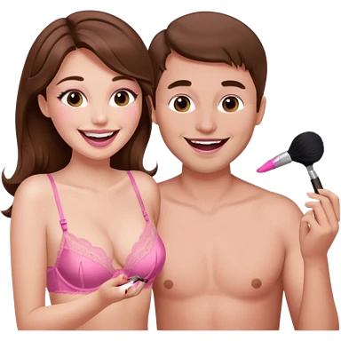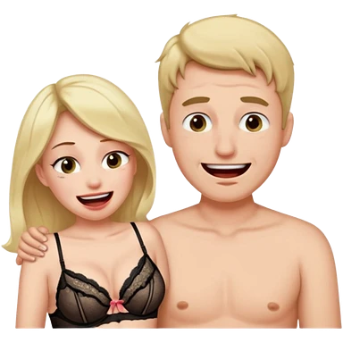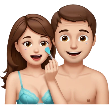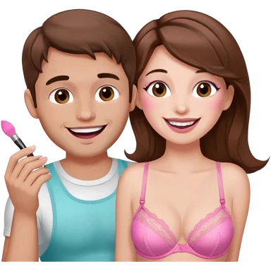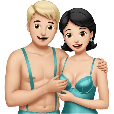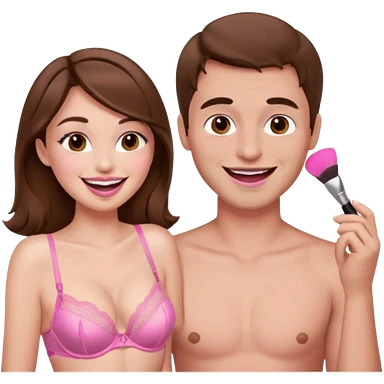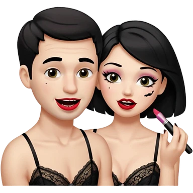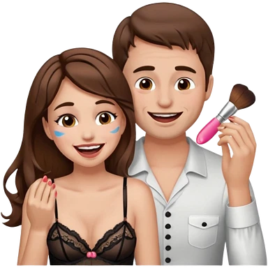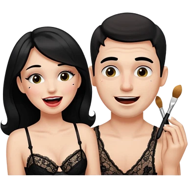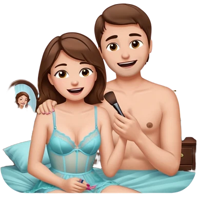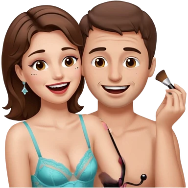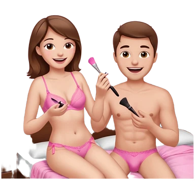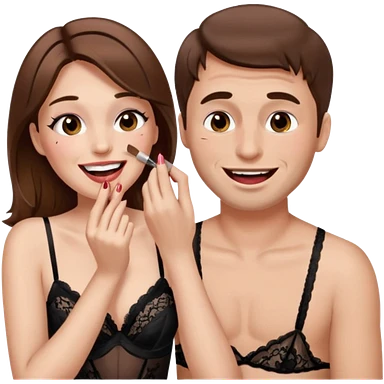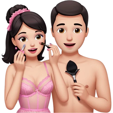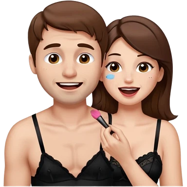 male getting sissified in lingerie by his smug wife. the wife is crying with laughter. she is doing the males makeup emoji