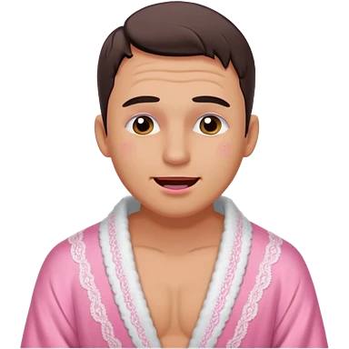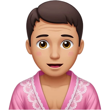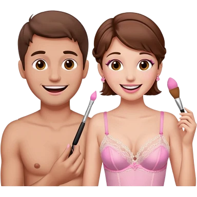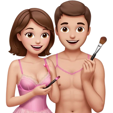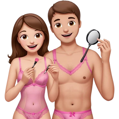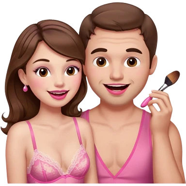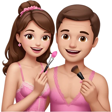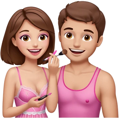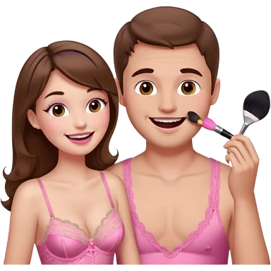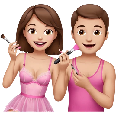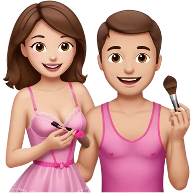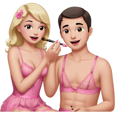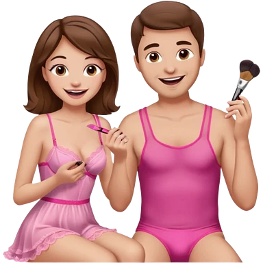brown hair male getting sissified in pink lingerie dress by his wife. the wife is crying with laughter. she is doing makeup emoji