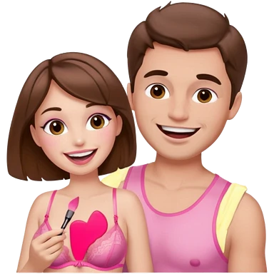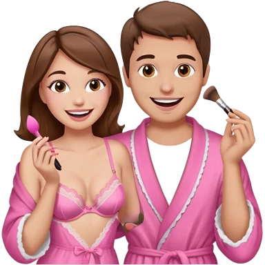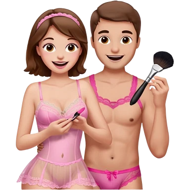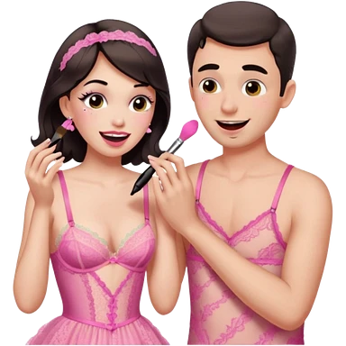 brown hair male getting sissified in pink lingerie dress by his wife. the wife is laughing. she is doing makeup emoji
