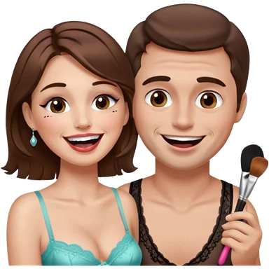 brown hair male getting sissified in lingerie dress by his wife. the wife is crying with laughter. she is doing makeup emoji