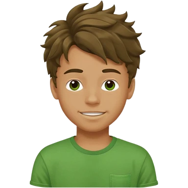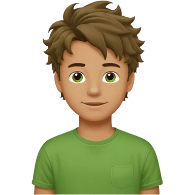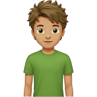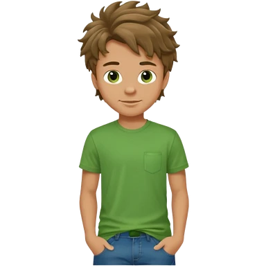 A 14 yerar old teenage boy, slightly tanned, wearing a green tshirt, blue jeans and green sneakers with brown tousled hair emoji