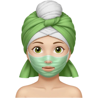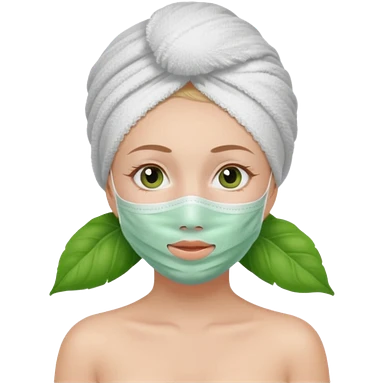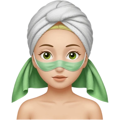 Una chica con una toalla en la cabeza y en el cuerpo y con una mascarilla facial emoji