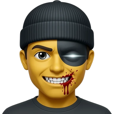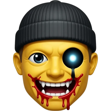 A noramal yellow emoji with the eyes dark and teath sharp with a beanie that covers one eye but the other eye that shows make it glow with a black beam and the sorrounding of the mouth with blood emoji