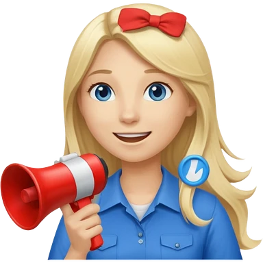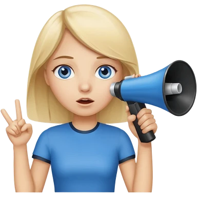 blue eyes blonde girl yelling into megaphone and holding up 1 finger in the other hand smiling long hair emoji