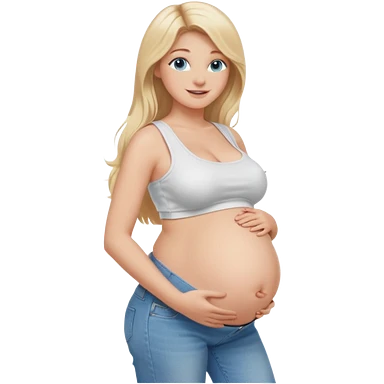 White girl, 18, long blonde hair, blue eyes, white crop top, jeans, huge pregnant belly, big boobs, side view, skinny, bare midriff, smiling emoji