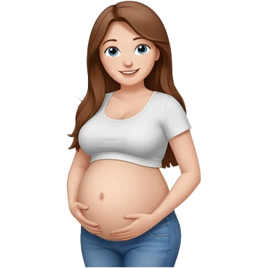 White girl, 18, long brown hair, blue eyes, white crop top, jeans, huge pregnant belly, big boobs, side view, skinny, bare midriff, smiling emoji