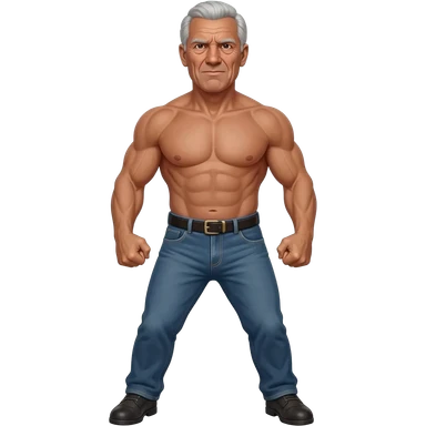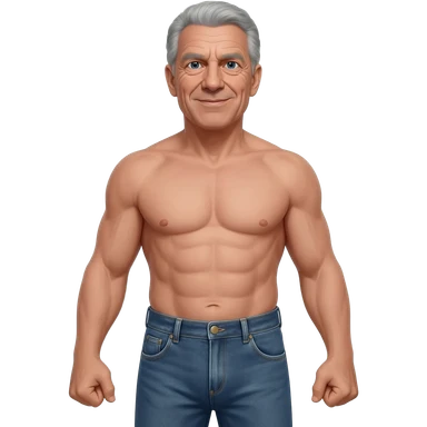 RFK Junior, u.s. health secretary, full body, a Grey haired old man with the voice of a broken robot with a wrinkly face that's "in shape" in a realistic photo style, full body, shirtless, full body super hero pose in jeans emoji