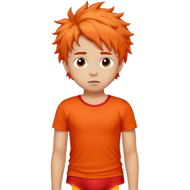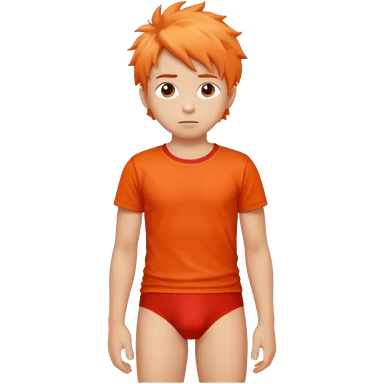A kid wearing a red pooped underwear with a orange t-shirt looking back emoji
