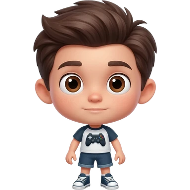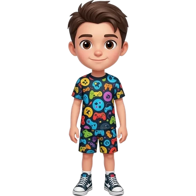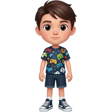Boy with dark brown hair, combed neat, parted to the side and brown eyes. Skinny. Wearing a video game themed shirt and shorts outfit with matching sneakers. emoji