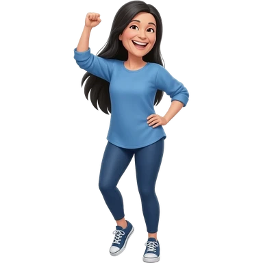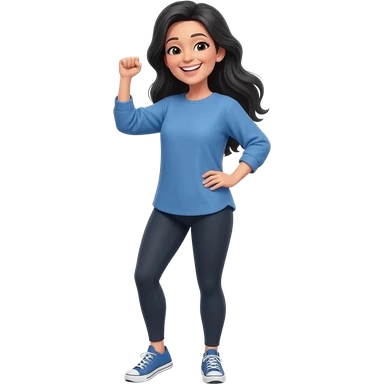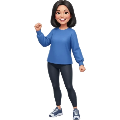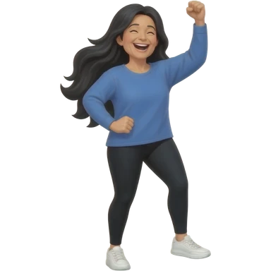 Middle aged woman with long black hair down her back. Wearing leggings, sneakers, a long sleeve blue shirt that fits loose. She is very skinny and tall. She is standing and smiling celebrating a victory.. emoji
