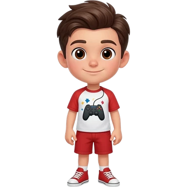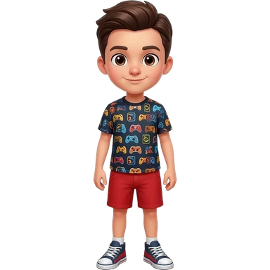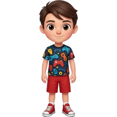 Boy with dark brown hair, combed neat, parted to the side and brown eyes. Wearing a video game themed shirt and red shorts outfit with matching sneakers. emoji