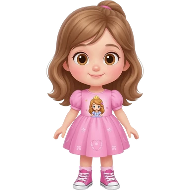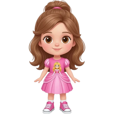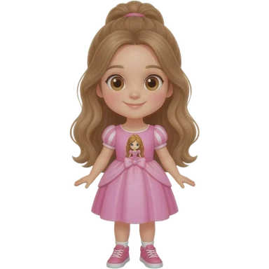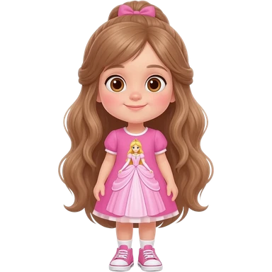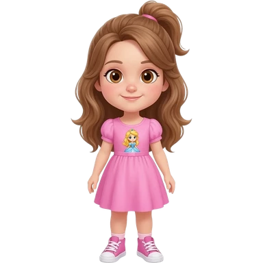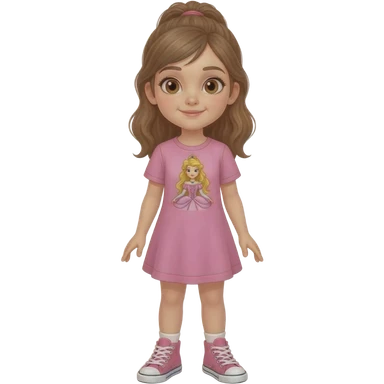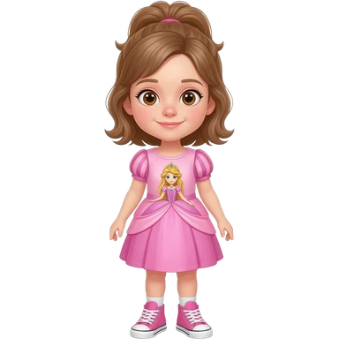 Young girl with long light brown hair, half up, light brown eyes. Wearing a pink dress with a princess theme picture on it, with matching pink sneakers.. emoji