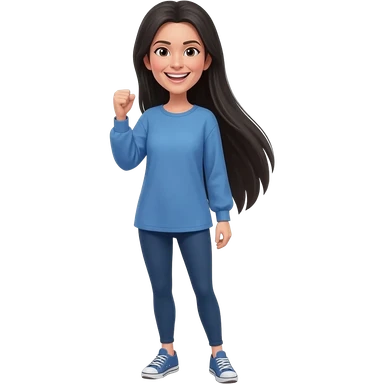 Middle aged white woman with long straight black hair down her back past her butt. Wearing leggings, sneakers, a long sleeve blue shirt that fits loose. She is extremely thin and tall. She is standing and smiling celebrating a victory.. emoji