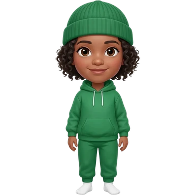 short black curly neck length hair. Wearing a green sweatsuit and a beanie hat. White socks. emoji