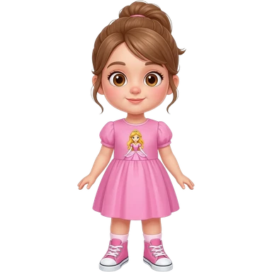 Young girl with light brown hair, half up, light brown eyes. Wearing a pink dress with a princess theme picture on it, with matching pink sneakers.. emoji