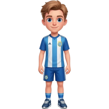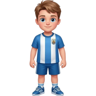 Teenage boy with light brown hair and blue eyes. Broad shoulders, slightly chubby. Wearing a soccer themed shirt and shorts outfit with matching sneakers. emoji