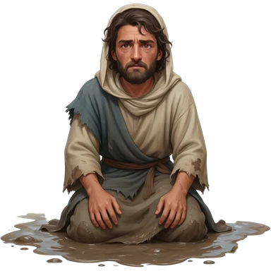 нарисуй раскаявшегося молодого человека на коленях в рваной одежде возрастом 20-24 года во весь рост , времена древнего иерусалима emoji