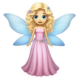 Fairy, a blonde hair with blue eyes and a pink dress with sparkly wings. Flowers. White wings. The fairy has long, curly hair with a lot of volume emoji