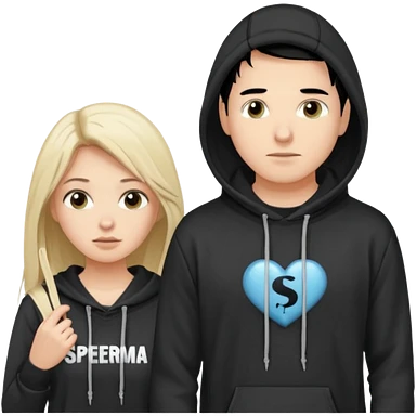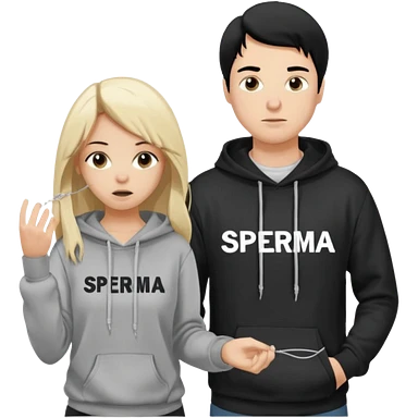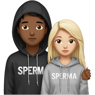 I want it to be this emote 🙍♂️ of a guy with black hair and a black sweatshirt with the word "sperma" written in white in the middle. Behind him, there's a pretty blonde with long hair, pulling the string on the first person's hoodie. The girl is wearing a gray sweatshirt. emoji