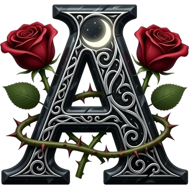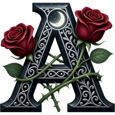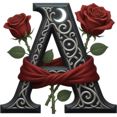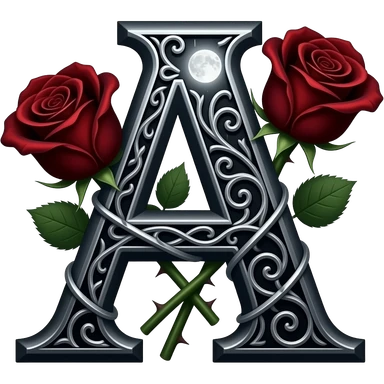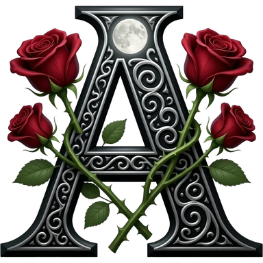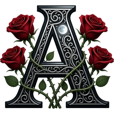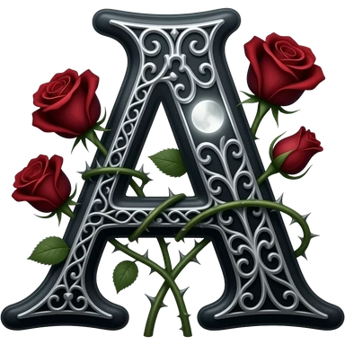 A heavy obsidian letter 'A' with silver filigree engraving. Deep red velvet roses with thorny stems wrap around the letter. Glowing moonlight effect, dark and moody atmosphere, high contrast, cinematic emoji