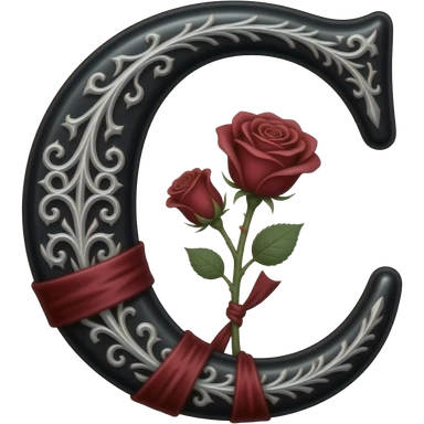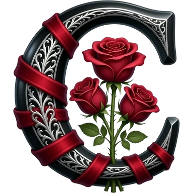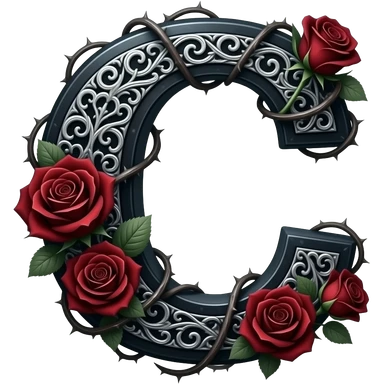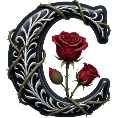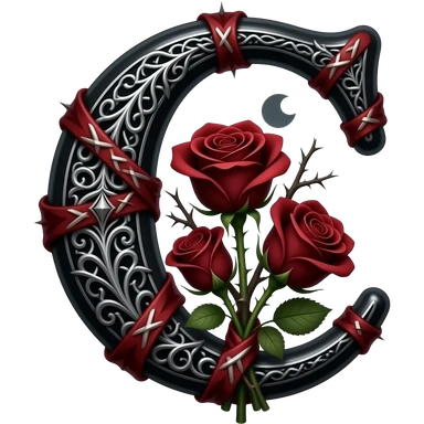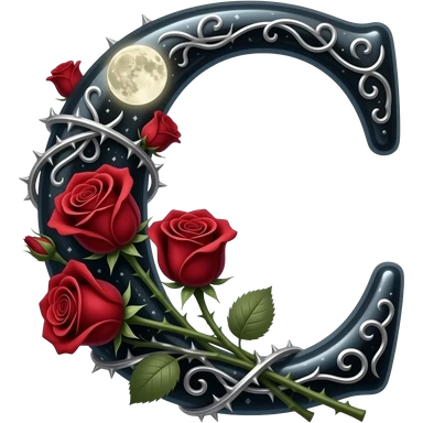A heavy obsidian letter 'C' with silver filigree engraving. Deep red velvet roses with thorny stems wrap over the letter. Glowing moonlight effect, dark and moody atmosphere, deep glowing emoji