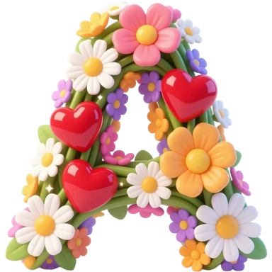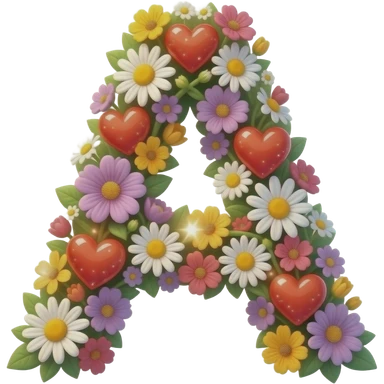 3D letter 'A' made of entwined colorful flowers and delicate white daisies. Softly glowing, ruby-red hearts are tucked between the petals. The entire letter emits a warm, ethereal many heart aura with sparkling light spots. High-gloss finish, centered on a white background emoji