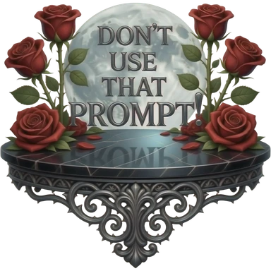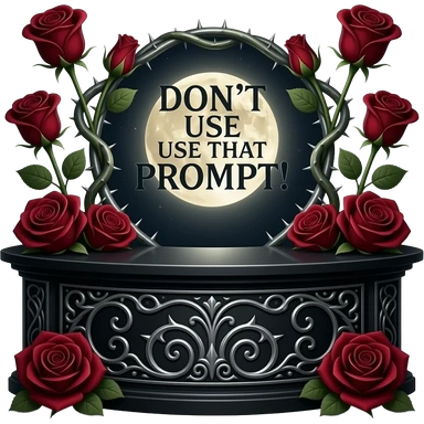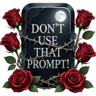 A heavy obsidian table bar text 'DON'T USE THAT PROMPT!' with silver filigree engraving. Deep red velvet roses with thorny stems wrap over the letter. Glowing moonlight effect, dark and moody atmosphere, deep glowing emoji