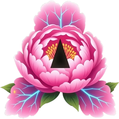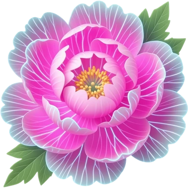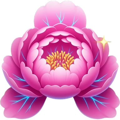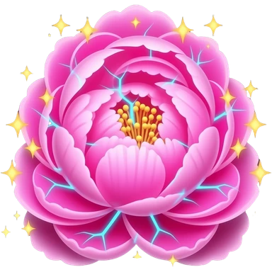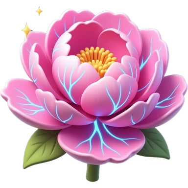 A lush, 3D Peony Emoji with petals that glow with an internal neon pink light. Fine electric-blue veins run through the petals, surrounded by floating golden sparkles. Isolated on a black background for maximum glow effect emoji