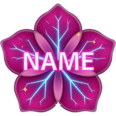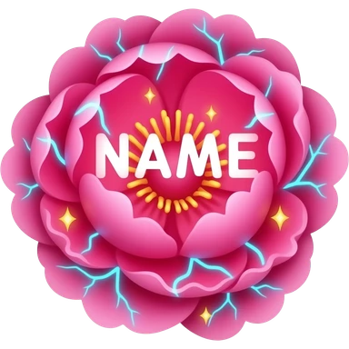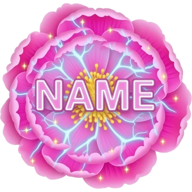 A lush, text 'NAME' with petals that glow with an internal neon pink light. Fine electric-blue veins run through the petals, surrounded by floating golden sparkles. Isolated on a black background for maximum glow effect emoji