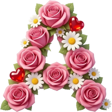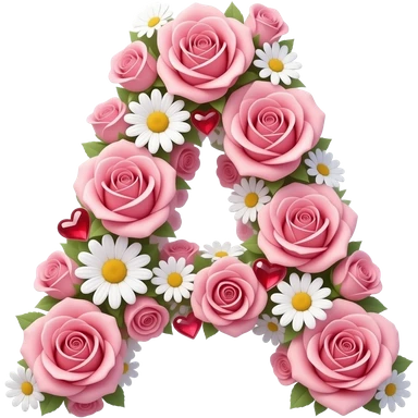 3D letter 'A' made of entwined pink roses and delicate white daisies. Softly glowing, ruby-red hearts are tucked between the petals. The entire letter emits a warm, ethereal aura with sparkling light spots. High-gloss finish, centered on a white background emoji