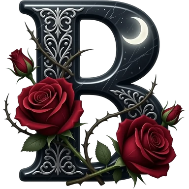 A heavy obsidian letter 'B' with silver filigree engraving. Deep red velvet roses with thorny stems wrap over the letter. Glowing moonlight effect, dark and moody atmosphere, deep glowing emoji