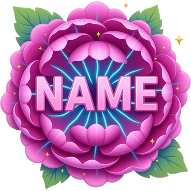 A lush, Peony text 'NAME' with petals that glow with an internal neon pink light. Fine electric-blue veins run through the petals, surrounded by floating golden sparkles. Isolated on a black background for maximum glow effect emoji