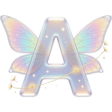 A glowing letter 'A' made of translucent fairy-wing material with iridescent veins. Tiny floating sparkles and golden dandelion seeds orbit the letter. Ethereal, dreamy, soft-focus background, 8k resolution. emoji