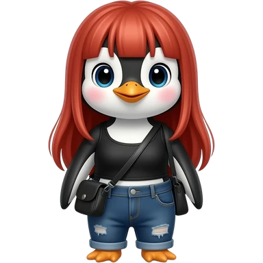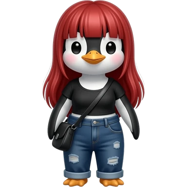make a cute baby penguin with long straight red hair wearing dark washed baggy jeans with no rips and a black fitted top and a black short strap bag emoji