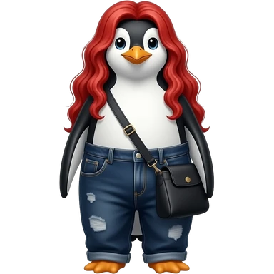 make a penguin with long red hair wearing dark washed baggy jeans and a black longchamp bag emoji