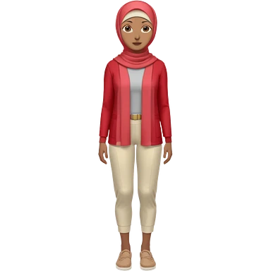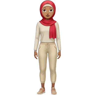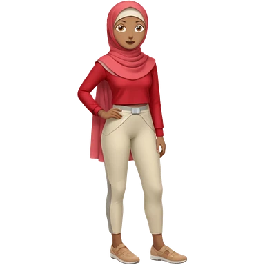 Heavy-set woman with medium-brown skin wearing a light red hijab, cream top, light red pants, tan shoes, and a grey prosthetic leg. Standing confidently with one hand on her hip emoji