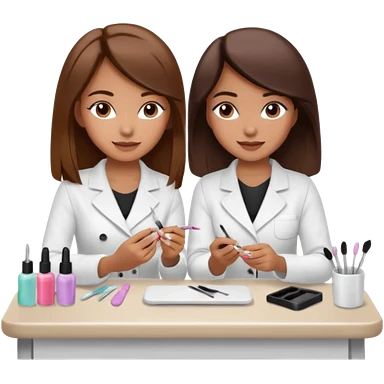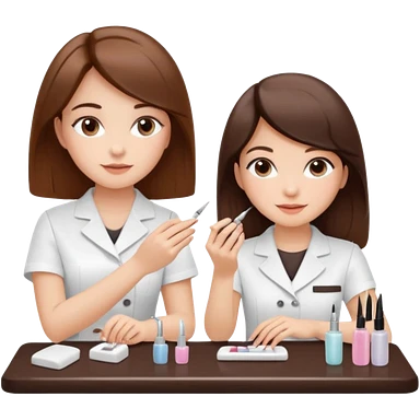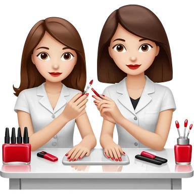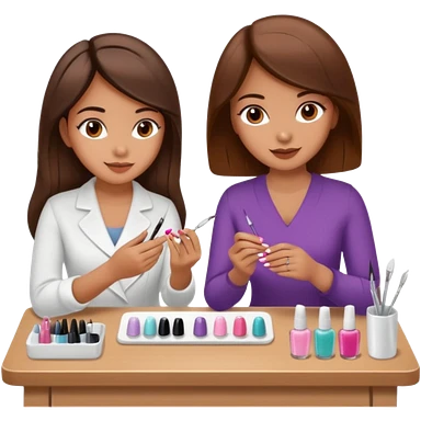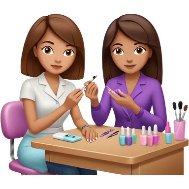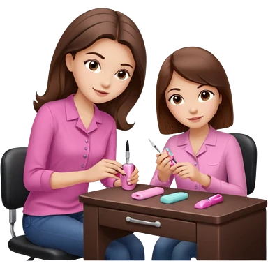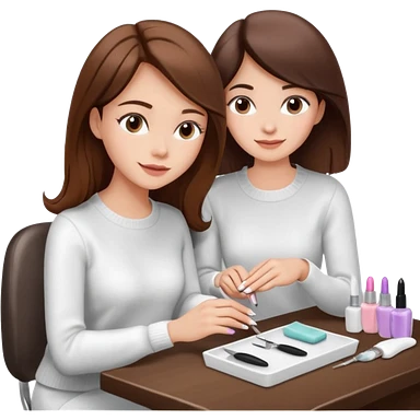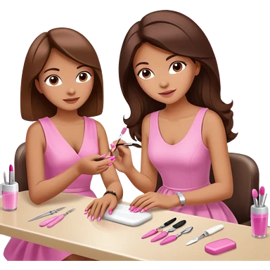 A realistic illustration of a girl with medium-length thick brown hair sitting at a manicure table. Another girl is carefully doing her nails, using professional manicure tools. Soft natural lighting, clean salon environment, detailed hands and nail work, warm and pleasant atmosphere. emoji