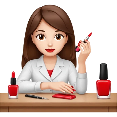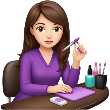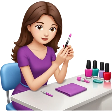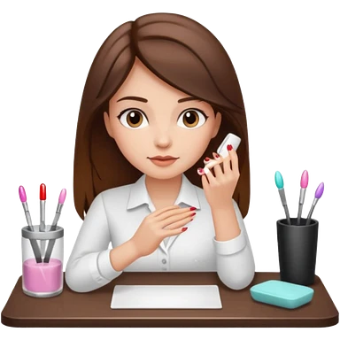A realistic illustration of a girl with medium-length thick brown hair sitting at a manicure table. emoji