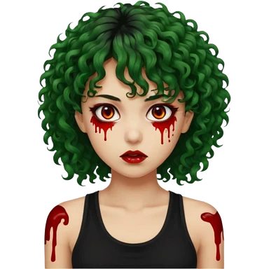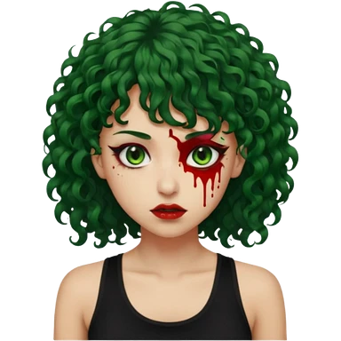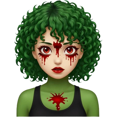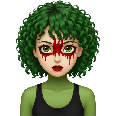 crie uma mulher, vibe total terror. mas ela com cabelo cacheado e franja. e pele verde. SAIA SANGUE DOS OLHOS VERMELHOS. ELA USA BLUSA REGATA PRETA. emoji