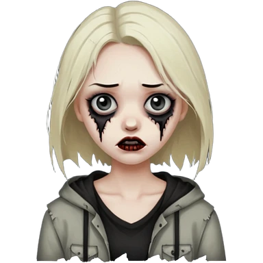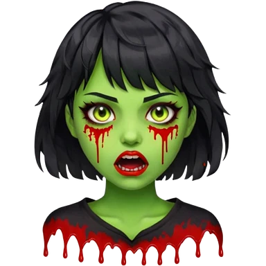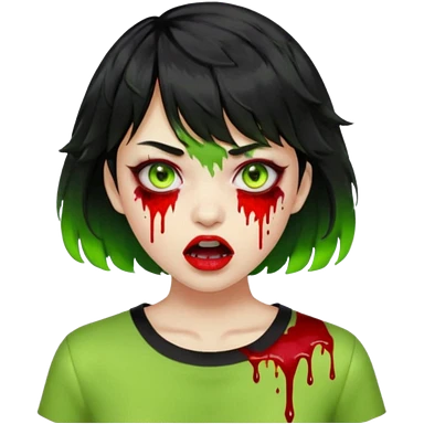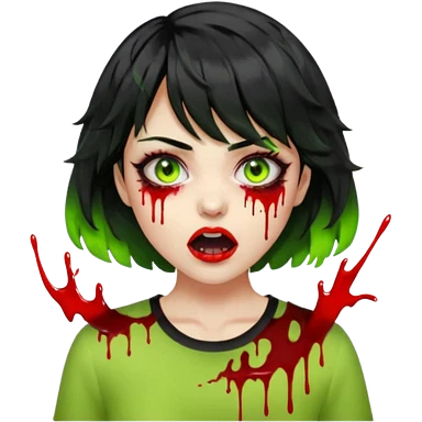 quero que você cria uma mulher, o rosto dela. nela, ela tem cabelo curto e ondulado(cabelo preto), tem franja. cor da pele é verde. os olhos arregalados e amarelos neon, e sai sangue deles. boca entreaberta e manchas de sangue na roupa. emoji
