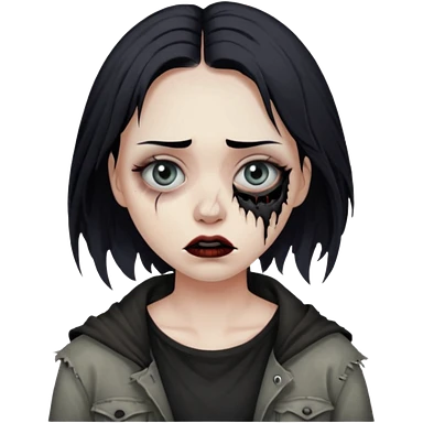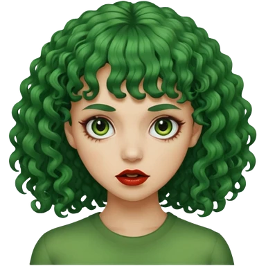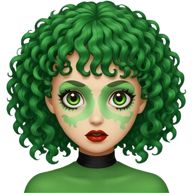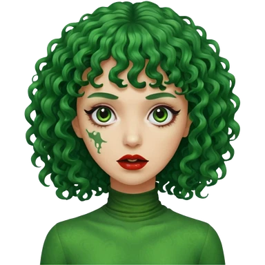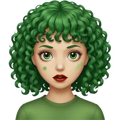 quero que você cria uma mulher, o rosto dela. nela, ela tem cabelo curto e ondulado, tem franja e ela tem semblante triste, deixe ela com pele verde e com cabelo cacheado( ela tem que ter semblante assustador e muito triste, ela pode ter olhos totalmente preto ou vermelho) emoji