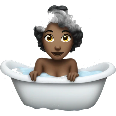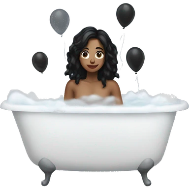 a woman with dark hair in Bathtub, black balloons around her emoji