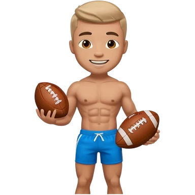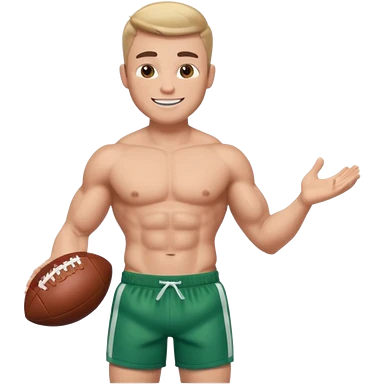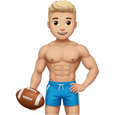 male memoji, shirtless muscular man with six-pack abs, wearing designer shorts, holding a football, confident and flirty smile emoji