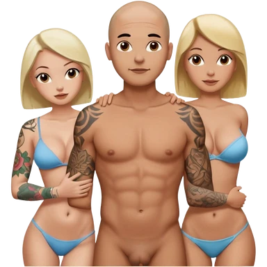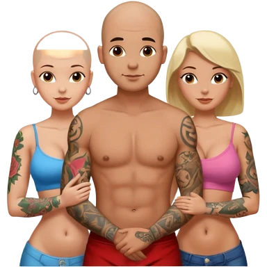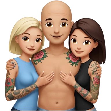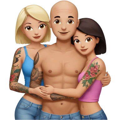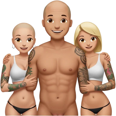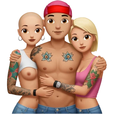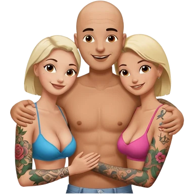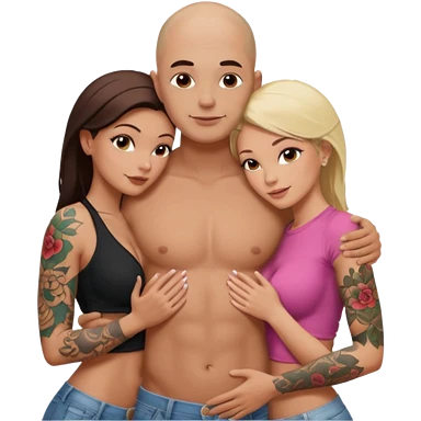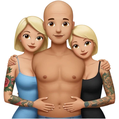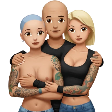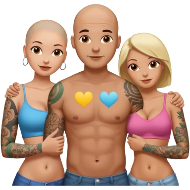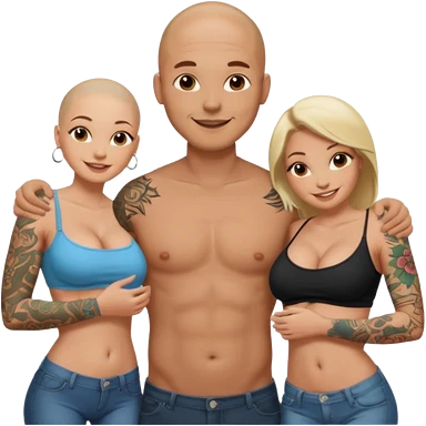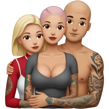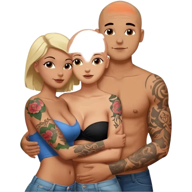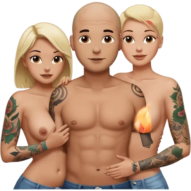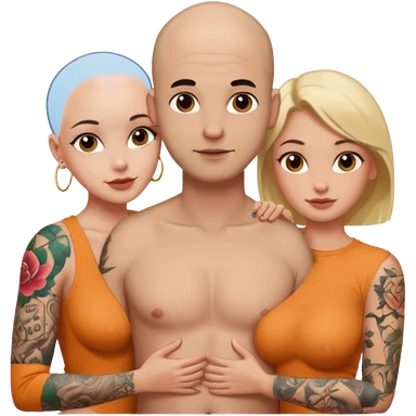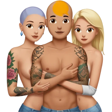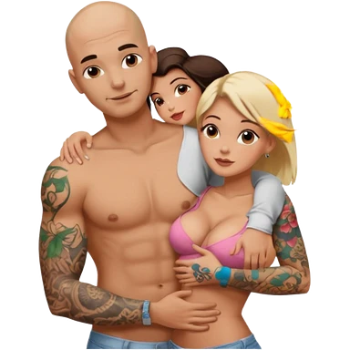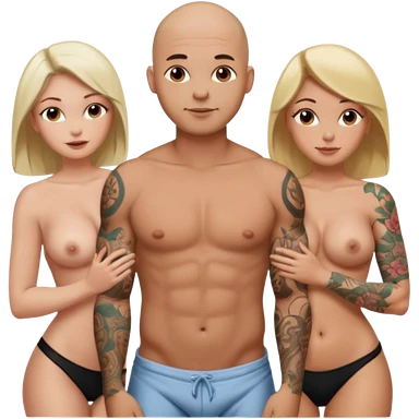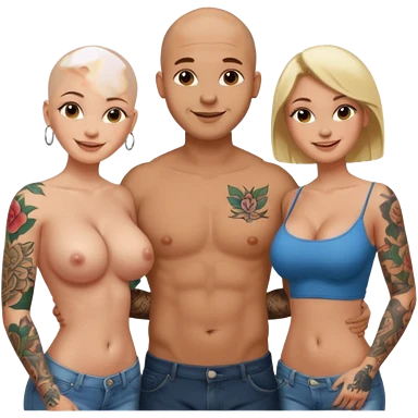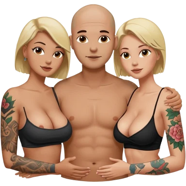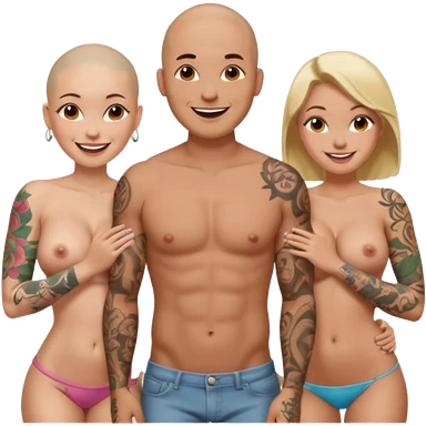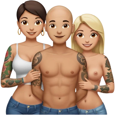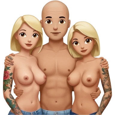 throuple tattooed sleeves bbald male with topless naked big boobed brunette and topless naked big boobed blonde girlfriends loving and sexy polygamy naughty emoji
