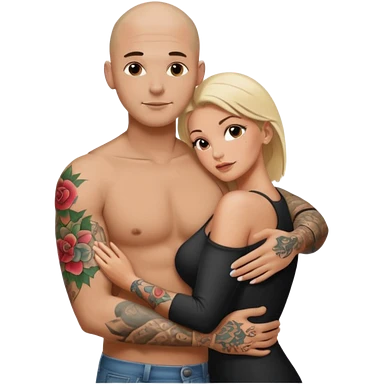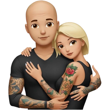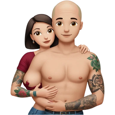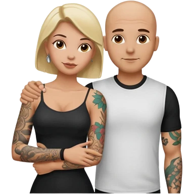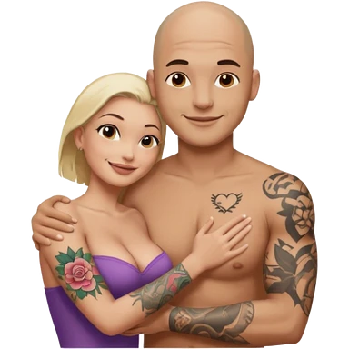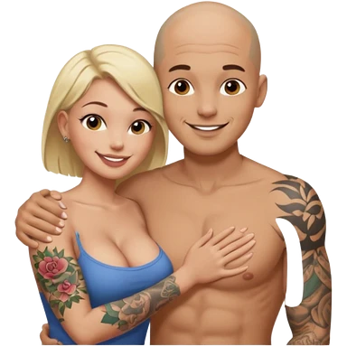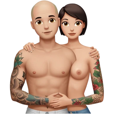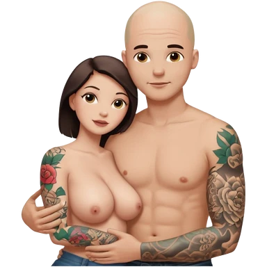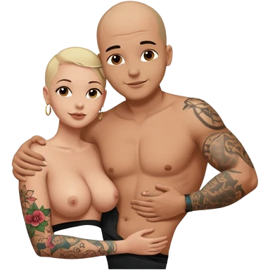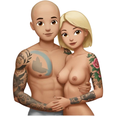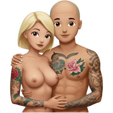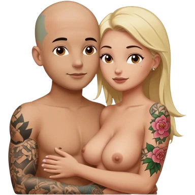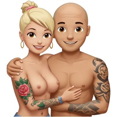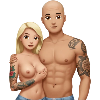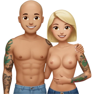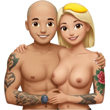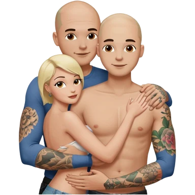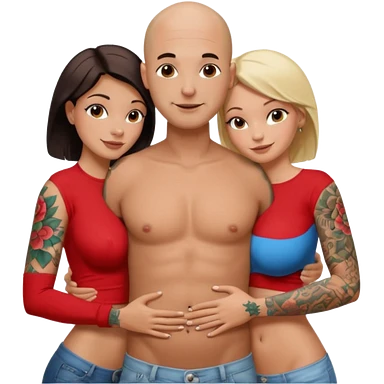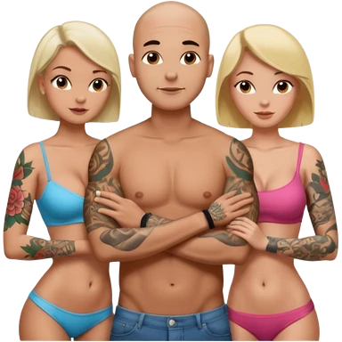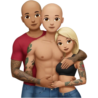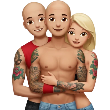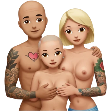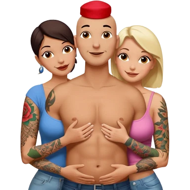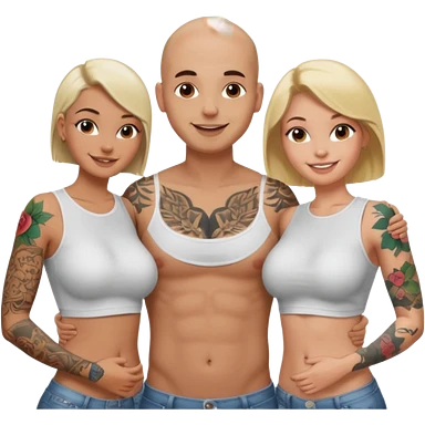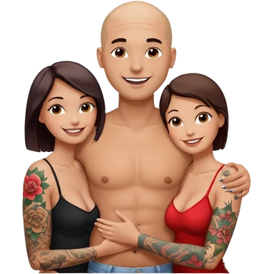throuple tattooed sleeves bbald male with topless naked big boobed brunette and topless naked big boobed blonde girlfriends loving and sexy polygamy naughty emoji