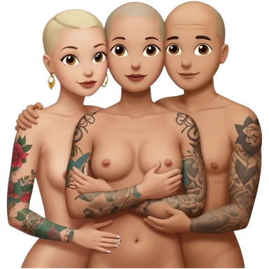 throuple tattooed sleeves bbald male with topless naked big boobed brunette and topless naked big boobed blonde girlfriends lovingl and sexy polygamy emoji